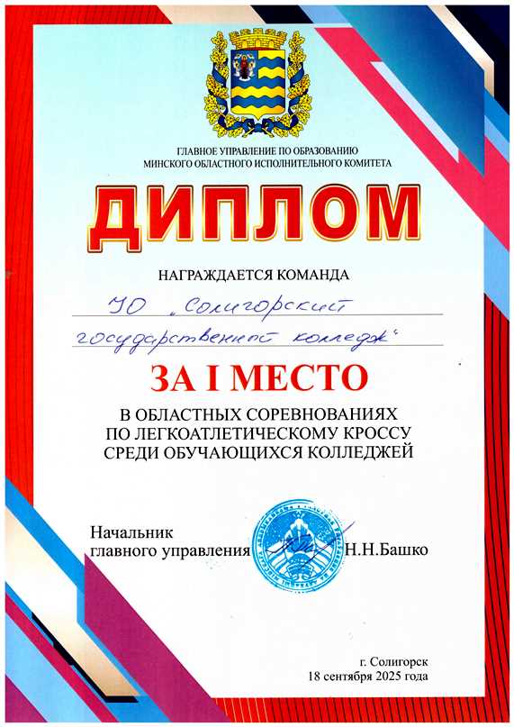 18 сентября 2025 года, в  лесопарковой зоне г.Солигорска, прошли    соревнования по легкоатлетическому кроссу в рамках  областной Спартакиады обучающихся колледжей-2025.      В соревнованиях приняли участие 27 команд Минской области. В общекомандном зачете  команда учащихся учреждения образования «Солигорский государственный колледж»     заняла  I место.    В личном зачете  учащиеся нашего колледжа   Горемыко Дарья и Синькевич Виоллета на дистанции 1 км заняли соответственно первое  и третье место. На дистанции   2 км на втором месте  Неронская Алеся.