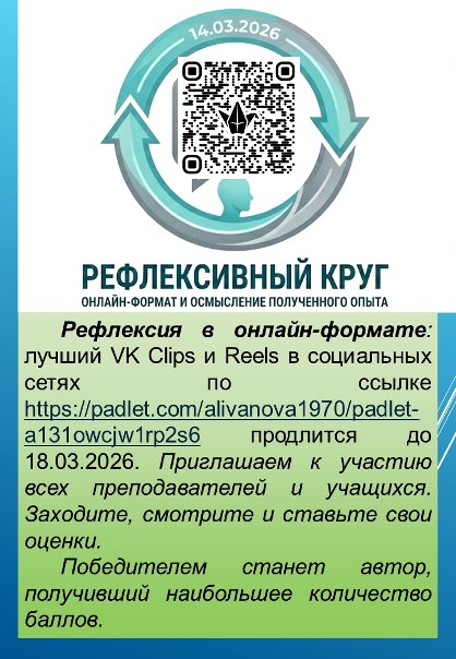 Рефлексия в онлайн-формате: определение лучшего VK Clips и Reels в социальных сетях по ссылке https://padlet.com/alivanova1970/padlet-a131owcjw1rp2s6 продлится до 18.03.2026. Приглашаем к участию всех преподавателей и учащихся. Заходите, смотрите и ставьте свои оценки. Победителем станет автор, получивший наибольшее количество баллов.