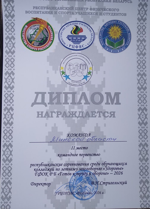 22-25 апреля 2026 года в республиканском центре олимпийской подготовки по зимним видам спорта «Раубичи» (Минский район), прошли республиканские    соревнованиях среди обучающихся колледжей по летнему многоборью «Здоровье» Государственного физкультурно-оздоровительного комплекса Республики Беларусь «Готов к труду и обороне»-2026.